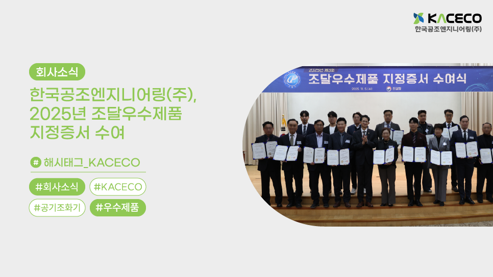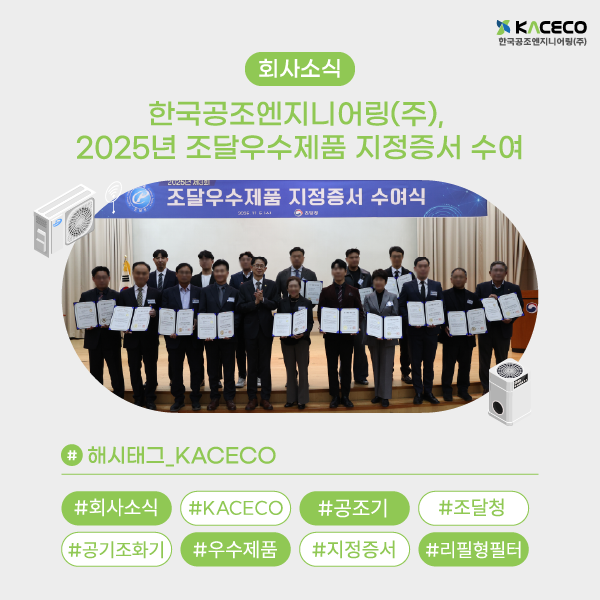 Áö³ 2025³â 11¿ù 5ÀÏ(¼ö), ¼¿ïÁö¹æÁ¶´Þû¿¡¼ ÀÇ¹Ì ÀÖ´Â Çà»ç°¡ ¿·È½À´Ï´Ù. Á¶´ÞûÀº ¿ÃÇØ Á¦3ȸ ¿ì¼öÁ¶´Þ¹°Ç°À¸·Î ÃÑ 60°³ Á¦Ç°À» ÁöÁ¤Çϸç ÁöÁ¤Áõ¼ ¼ö¿©½ÄÀ» ÁøÇàÇß½À´Ï´Ù. ƯÈ÷ À̹ø Çà»ç¿¡¼ Çѱ¹°øÁ¶¿£Áö´Ï¾î¸µ(ÁÖ)ÀÇ '¿¡³ÊÁö¼Òºñ Àý°¨Çü °íÈ¿À² °ø±âÁ¶È±â¡¯°¡ ¿ì¼öÁ¶´Þ¹°Ç°(Á¶´Þ¿ì¼öÁ¦Ç°)À¸·Î ¼±Á¤µÇ¾î ÁöÁ¤Áõ¼¸¦ ¼ö¿©¹Þ¾Ò½À´Ï´Ù.